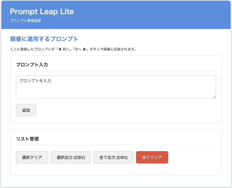 Prompt Leap Liteの管理画面。プロンプトの追加等ができます。