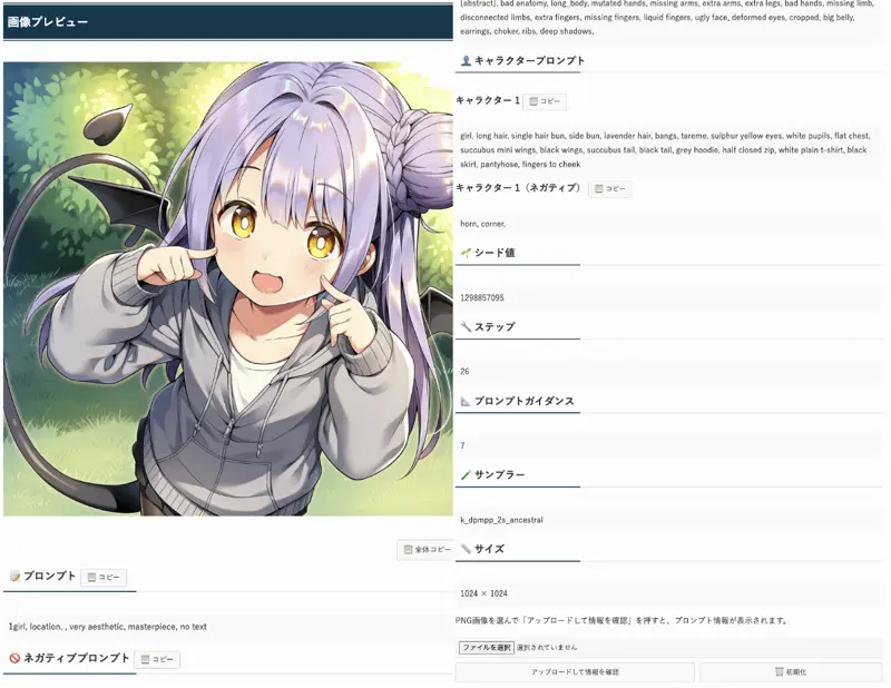 PNG画像を選んで「アップロードして情報を確認」を押すと、プロンプト情報が表示されます。